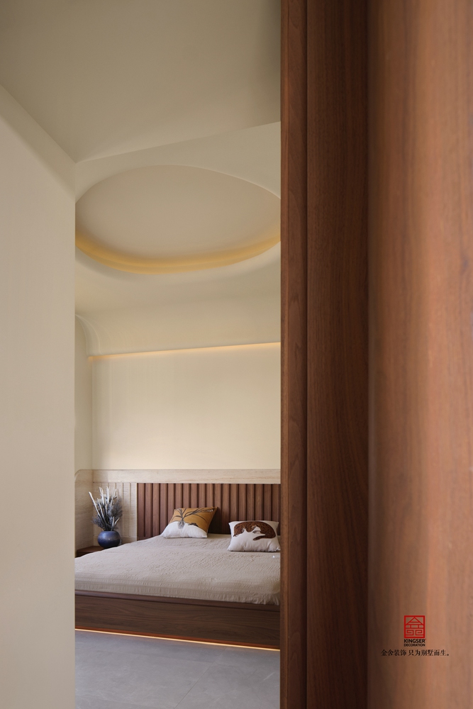 胡桃木色家具搭配同色系的墻板,床頂面的弧形處理讓人在睡眠中感受到更多的溫馨與安寧。