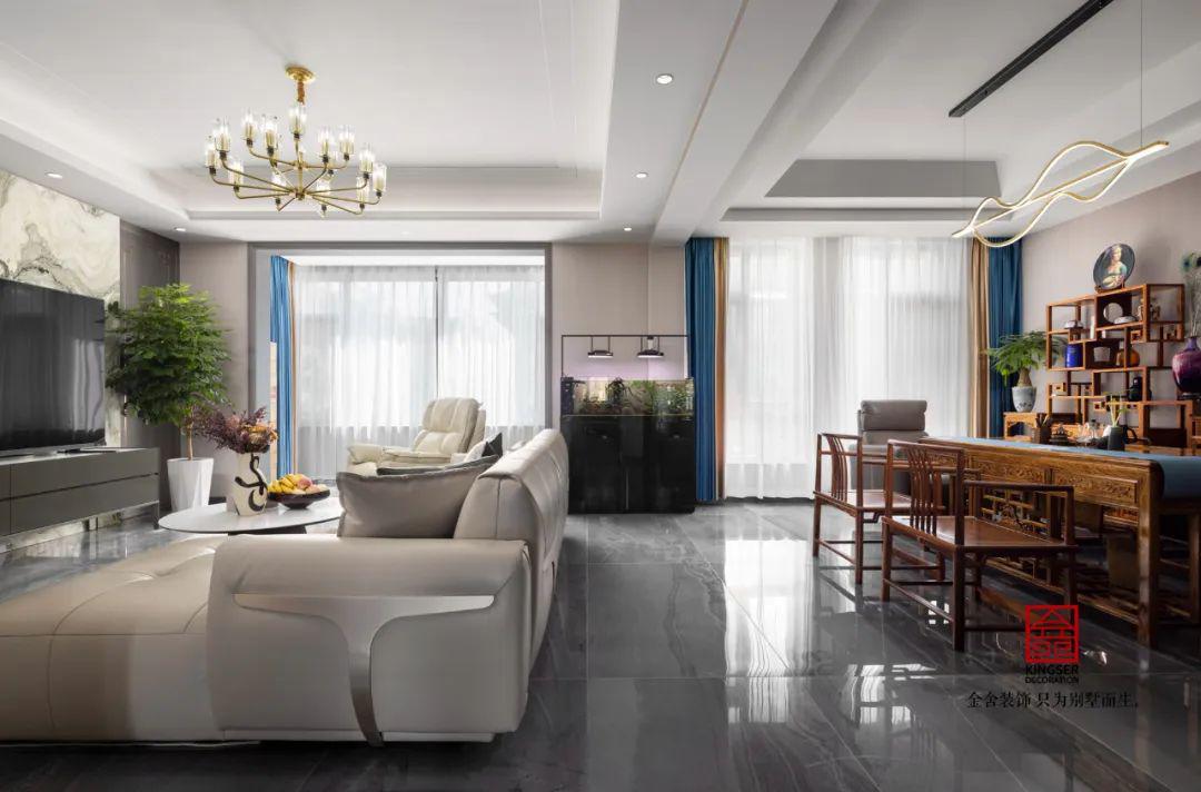 混搭的風格讓空間看起來十分的特殊,現代輕奢的客廳與中式的書房合二為一,客戶是中年夫妻,對于生活還是十分有品味的。