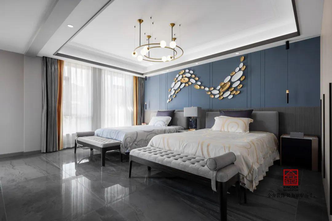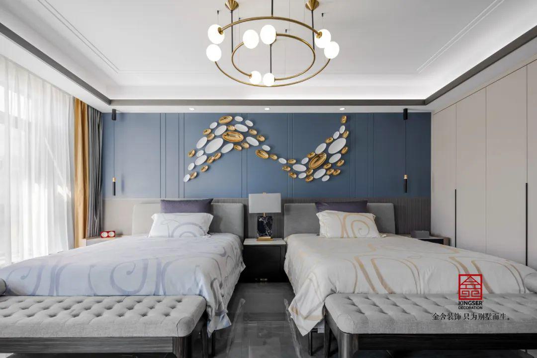 二樓通過功能分區實現臥室空間的最大化利用,主臥采用雙床錯位布局提升睡眠舒適度,床頭背景墻以水波紋理裝飾營造沉浸式睡眠氛圍。內部獨立設置桑拿房與休閑陽臺,通過玻璃隔斷實現干濕分離,既滿足養生需求又延伸休閑功能。
