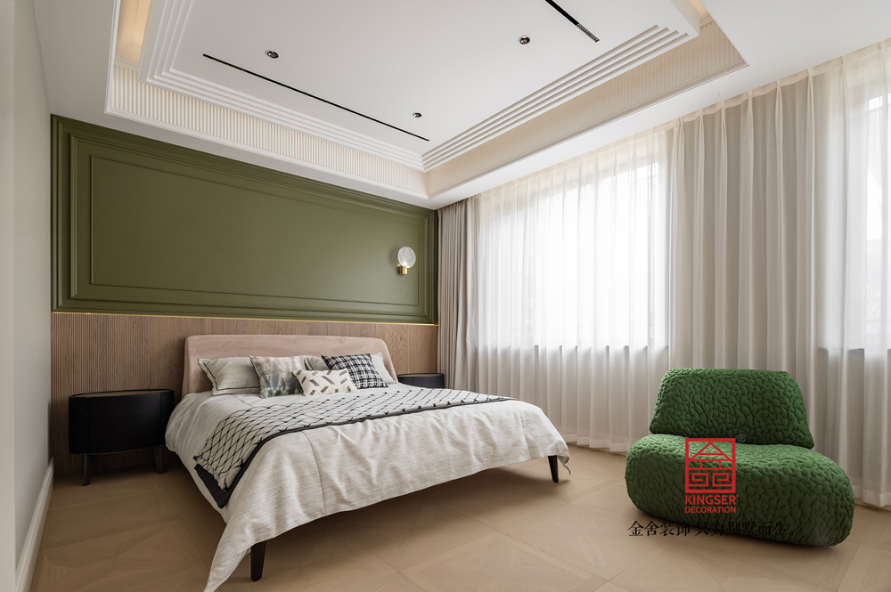 三樓主臥空間納入窗外四季風光意境,簡潔、舒適、寧靜,在這個臥室體現得淋漓盡致,設計就該更于回歸生活,并非不食煙火,而是剔除了方方面面的冗雜,以更鮮明更清晰的方式去表達出眼下的狀態。