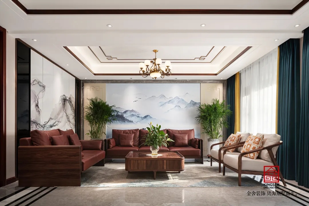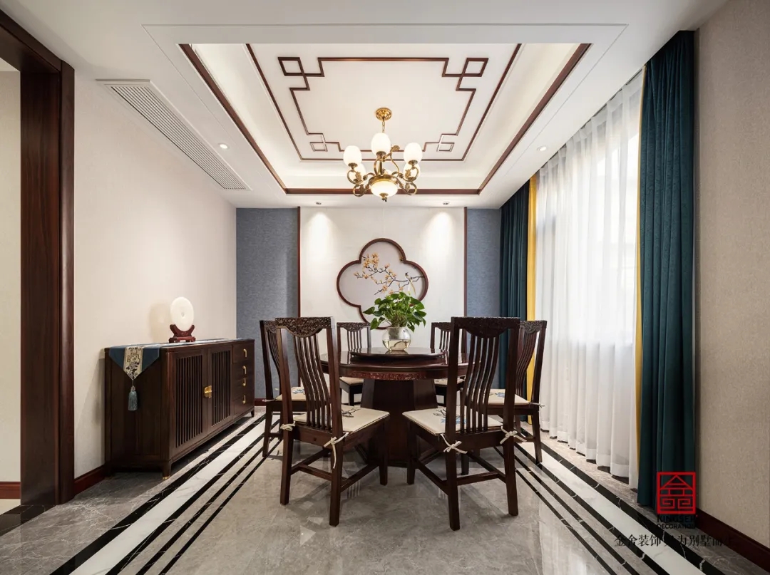 此案例為金舍裝飾-大者別墅300平米新中式風格裝修實景。繽紛的世界,滿眼的山色。時常仰慕古人,可以把顏色分得如此細膩,連名字也起得那般富有詩意:翠為山色,碧為湖色,丹是云霞升騰。顏色,是渾然天成的畫,是生活經驗凝結成的詩,人們一見名字,便心領神會,在腦里生出了意境。
