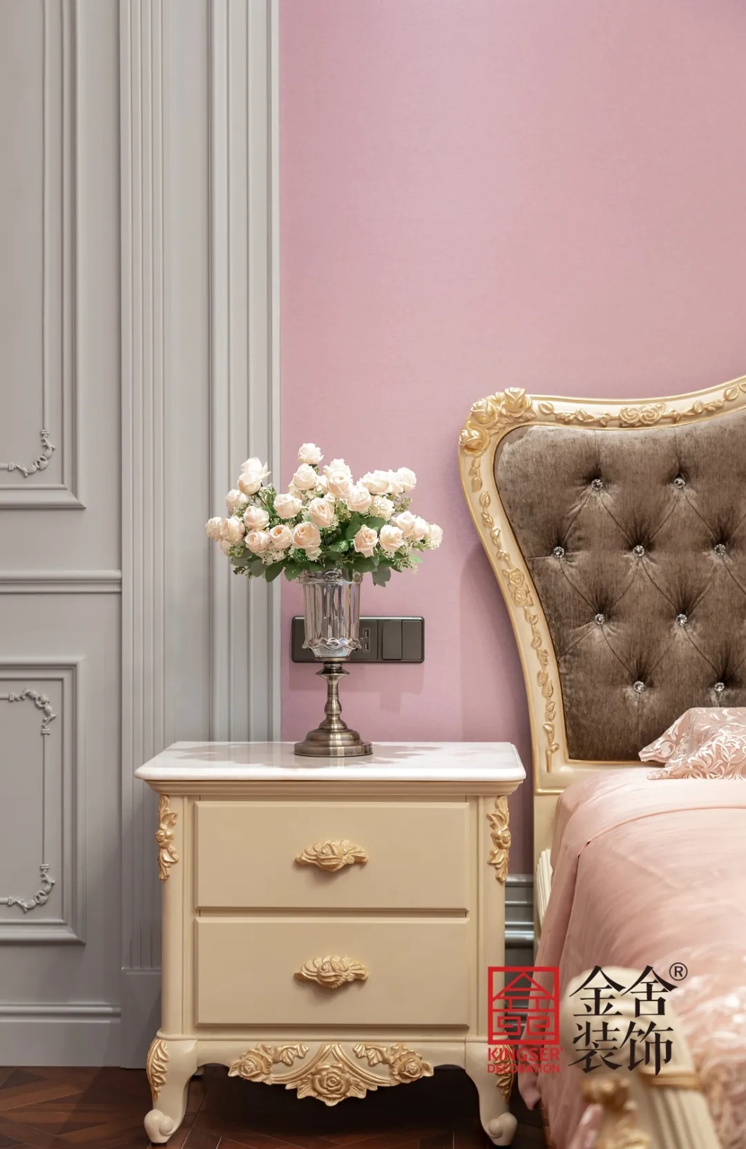 二樓的女兒房也是個套房,女兒房,閱讀室,衛生間和一個小的換衣間。滿足了孩子需求的全部功能。在色調的選擇上,設計師選用了以粉色為主,暖色調更容易營造出一個溫馨的氛圍。柔和的暖色燈光,讓女兒房多了一絲溫馨柔美。