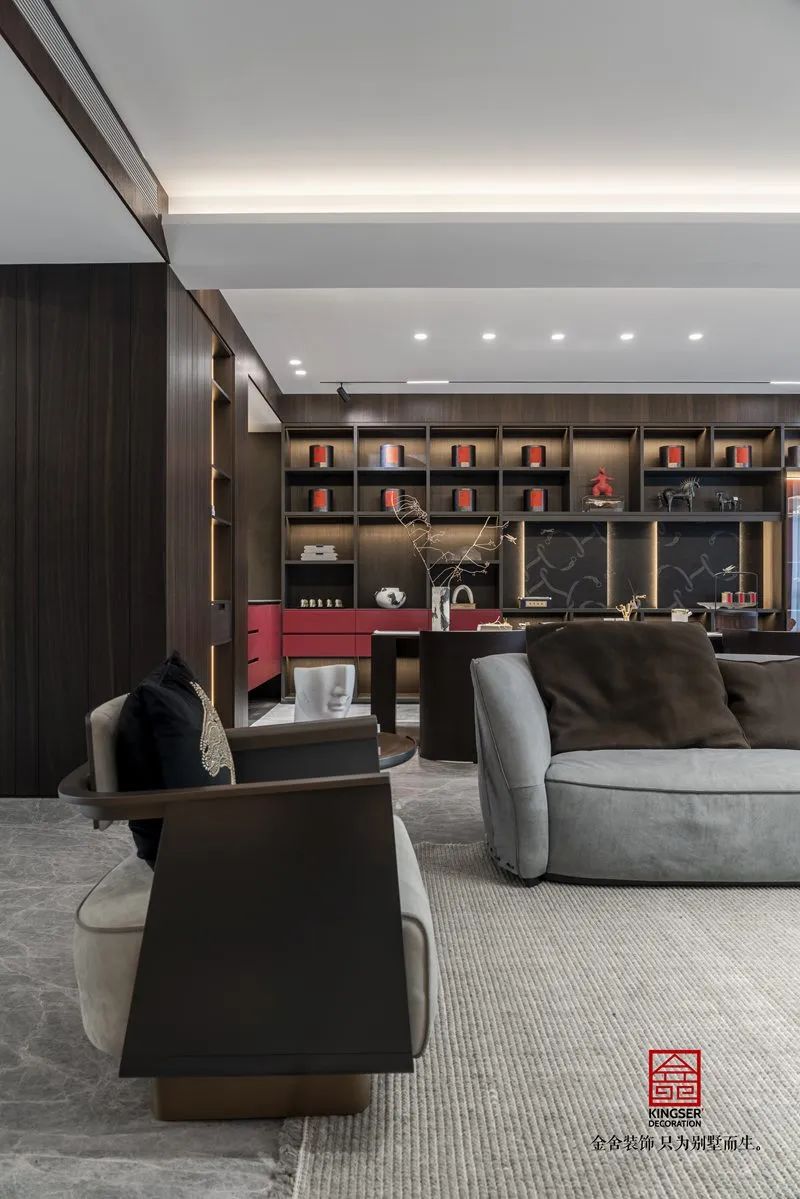 整體使用的顏色整體濃重而和諧。橫平豎直的空間線條里,質感木紋如墨色般暈染開來,木質、金屬、巖板等材質亦悄然置入,東方情韻與現代時尚的骨骼大膽融合,相得益彰。典雅高顏值,看得出設計師的優秀的能力與業主的不凡品味。