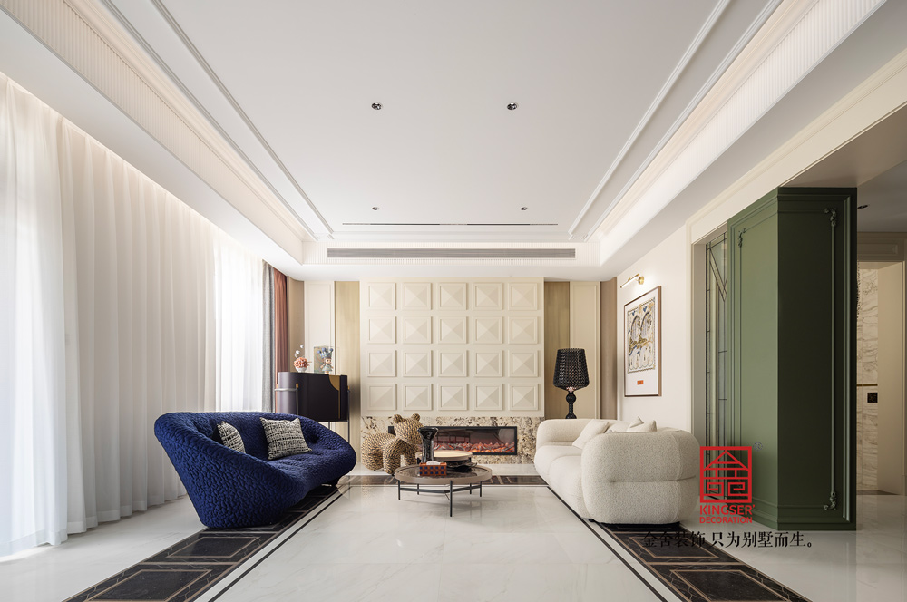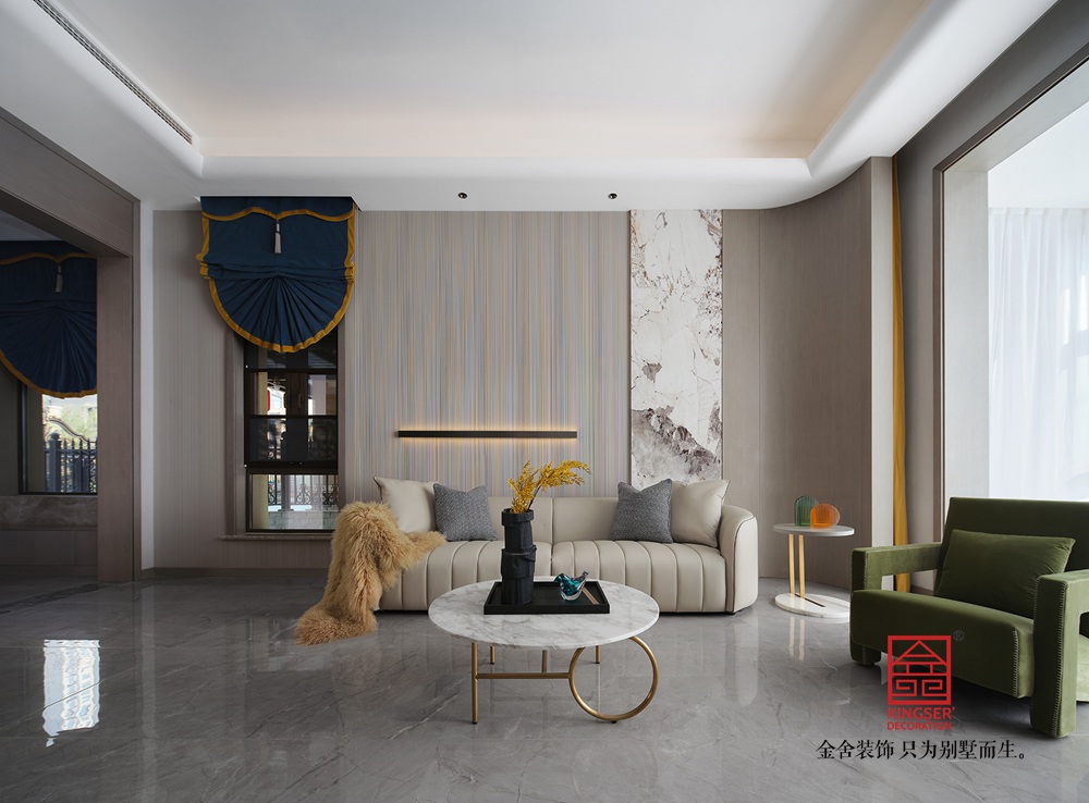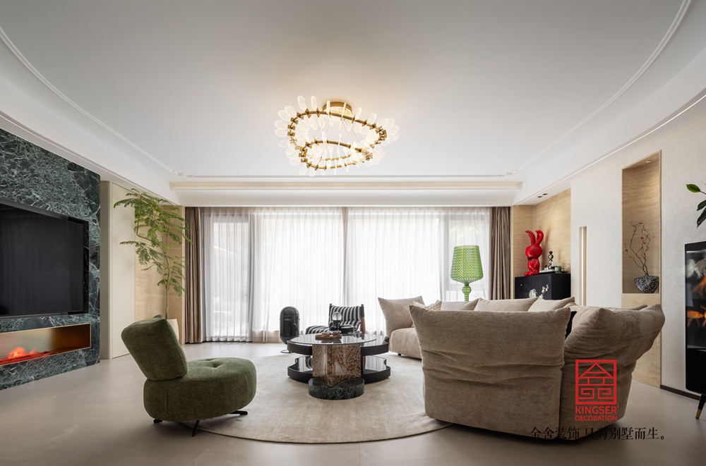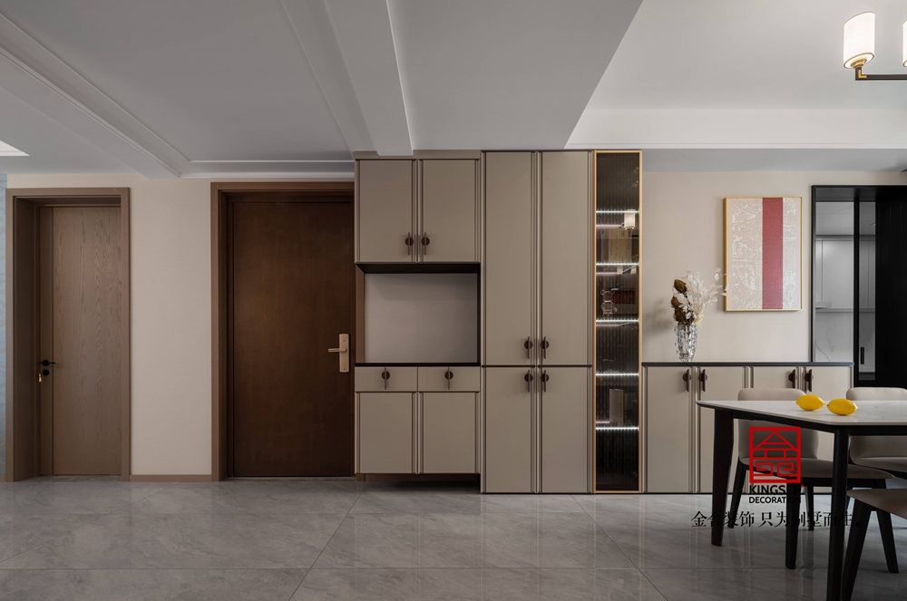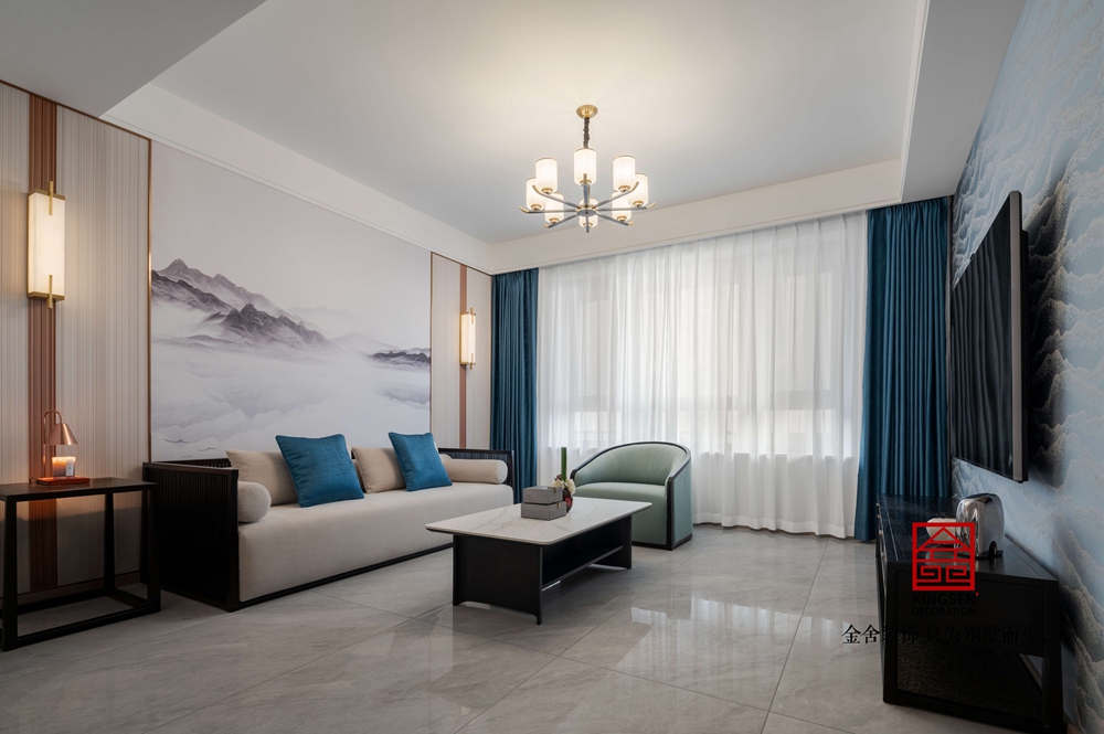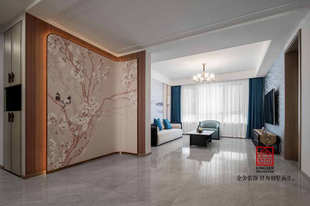 此案例為金舍裝飾-東南智匯城165平米新中式風(fēng)格裝修實(shí)景。客廳是沒(méi)有陽(yáng)臺(tái)的所以說(shuō)采光是這個(gè)戶型的比較大的一個(gè)痛點(diǎn),結(jié)合這個(gè)原因,設(shè)計(jì)師沒(méi)有用一些傳統(tǒng)的墻板來(lái)做這樣的造型,而是采用了肌理感非常強(qiáng)的維詩(shī)康的壁布來(lái)做造型,環(huán)保性非常強(qiáng),顏色的選擇也很多,本案選擇的顏色是琥珀金色,比較貼合新中式的風(fēng)格
