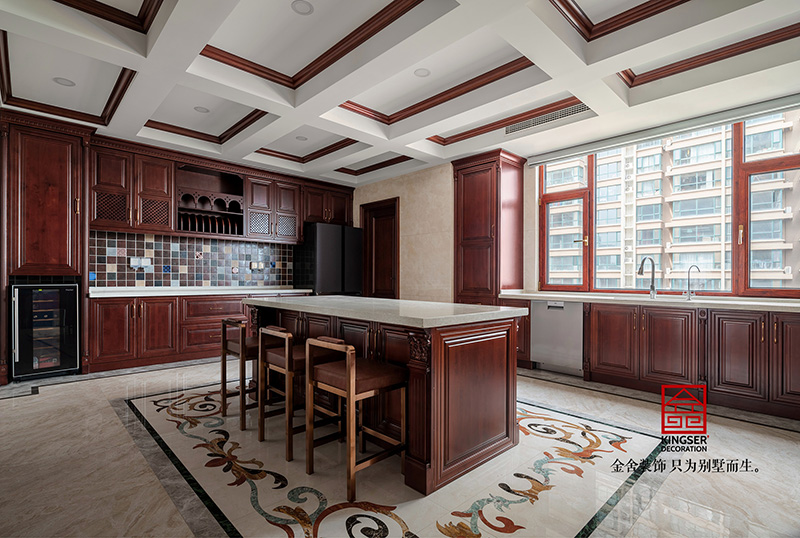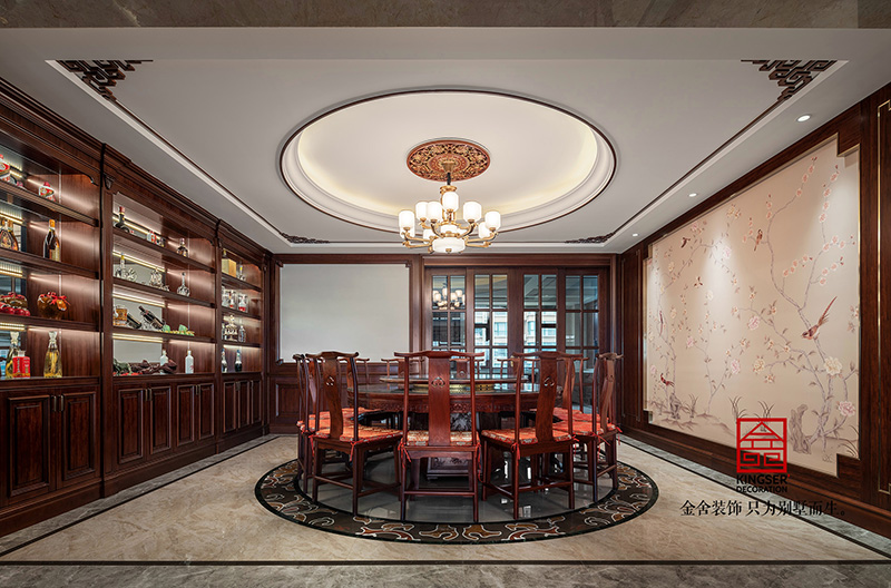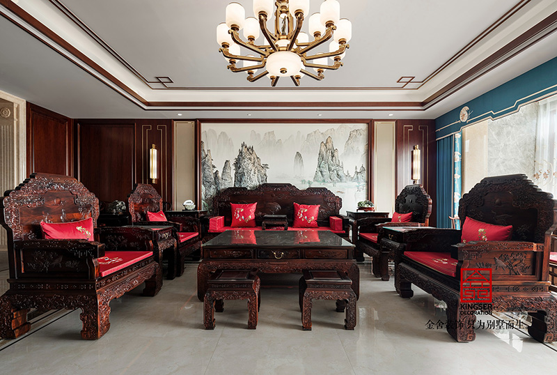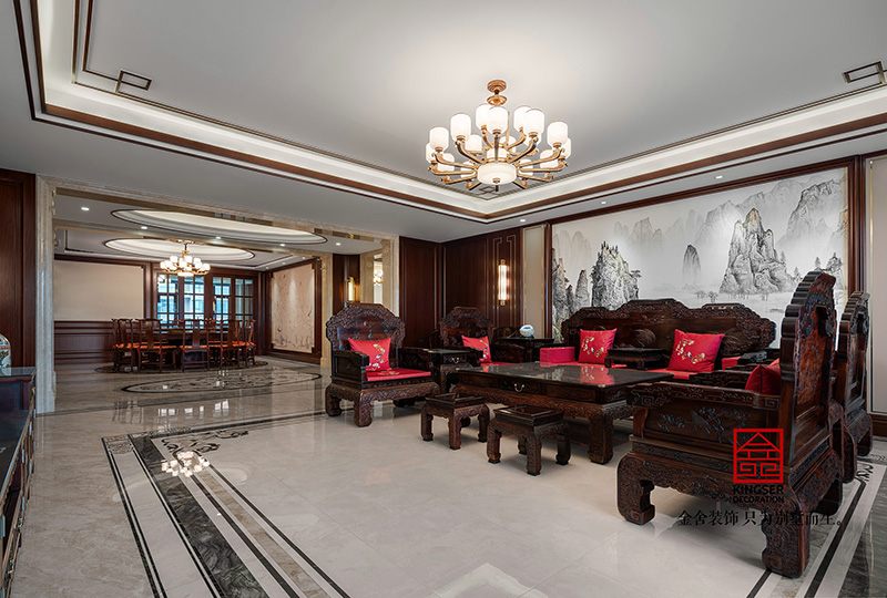 金舍裝飾-天下玉苑500平中式風格實景拍攝,奢華大氣的超大平墅,走廊長度達到17米,貫穿客餐廳,休閑區,以及三個臥室,氣宇非凡。客廳采用大紅酸枝的13件套,品質上乘,沙發細節的祥云圖案,纏枝蓮紋手工打造,茶幾的圖案選用松鶴延年,四周是梅蘭竹菊,象征著長壽和健康,也寓意著吉祥和祥瑞。