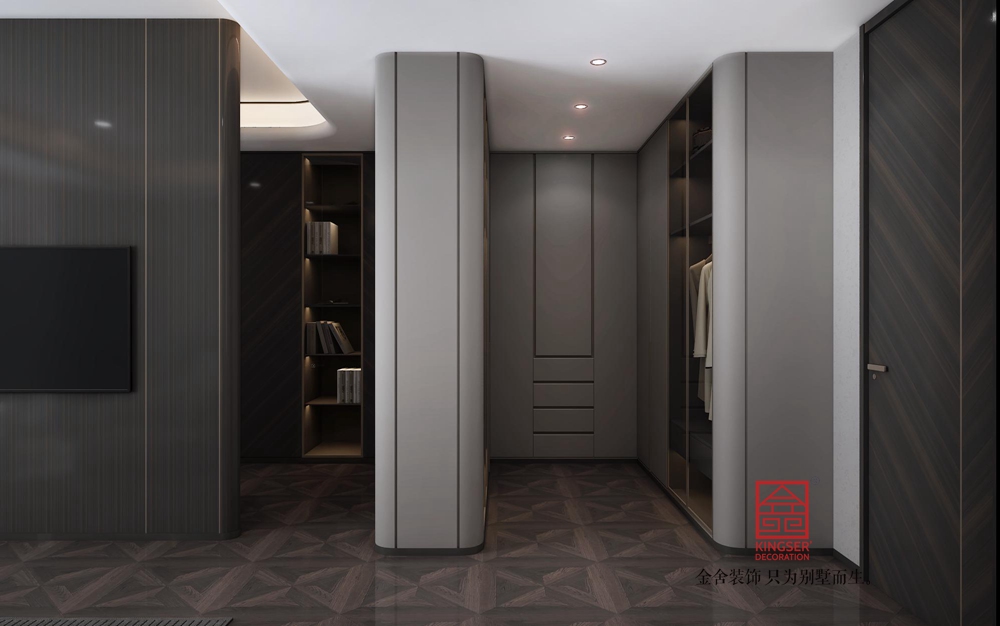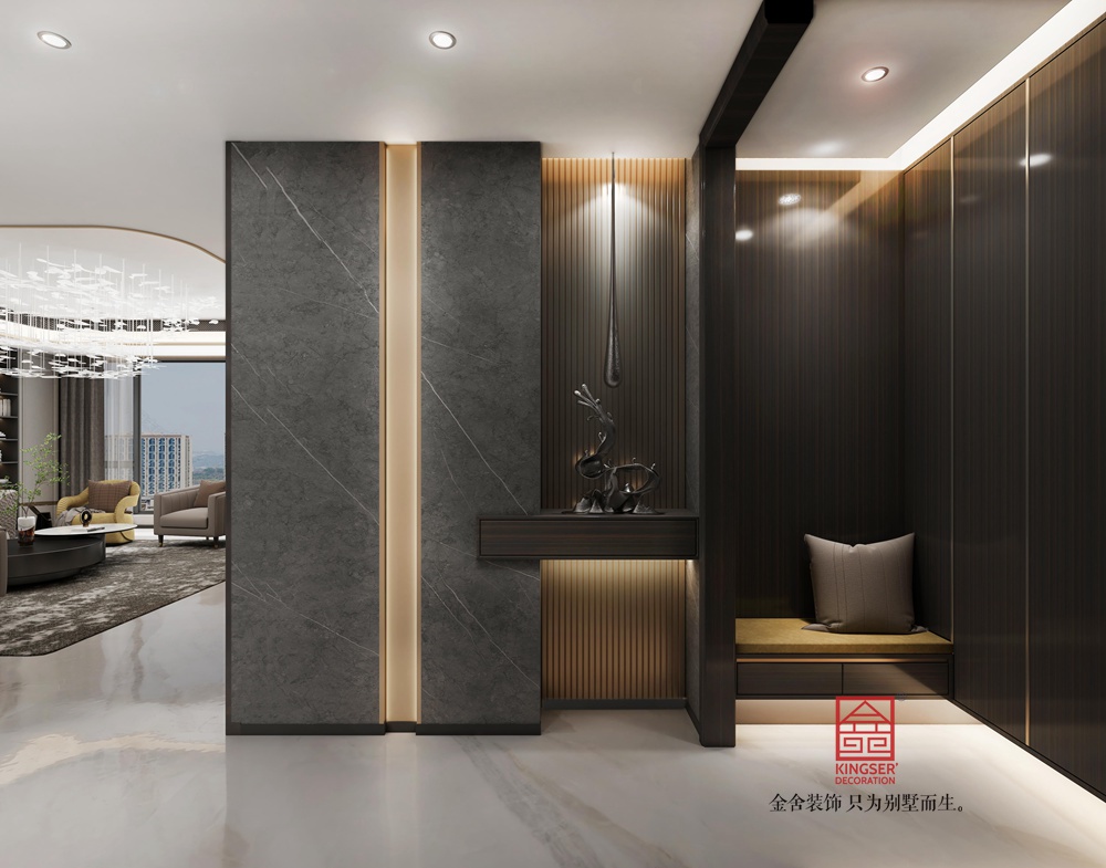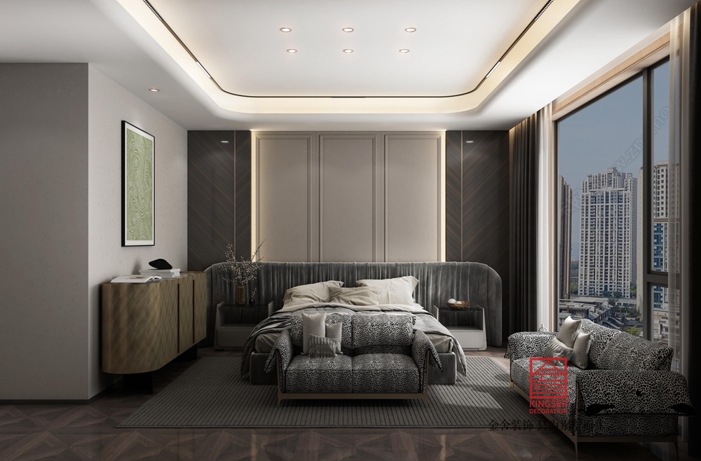 設計說明: 空間布局上,開放式格局連通視覺,大窗引入城市景觀,拓展視野與采光。頂面采用懸浮吊頂,搭配線性燈光,結合藝術感十足的白色創意吊燈,塑造精致氛圍。墻面以深灰為主調,電視背景墻用金屬線條勾勒,強化輕奢質感,兩側深色木質護墻增添層次。