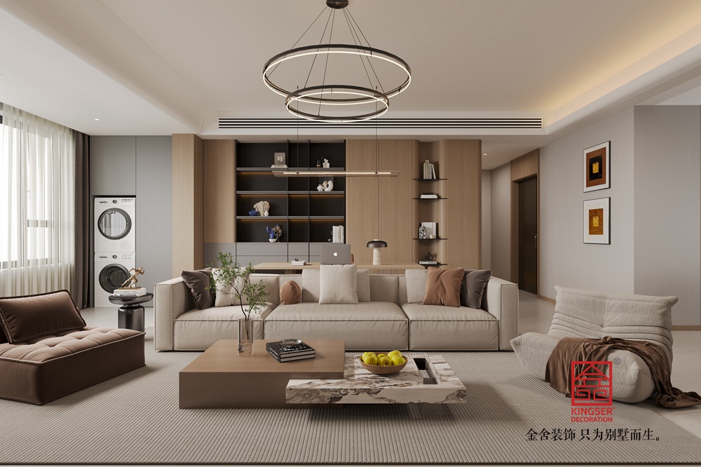 本客廳設(shè)計(jì)以現(xiàn)代簡(jiǎn)約風(fēng)格為核心,主打溫暖柔和的大地色系。空間布局上,將休閑與功能區(qū)巧妙融合,背景墻處的柜體設(shè)計(jì),兼具收納與展示功能,燈光點(diǎn)綴更顯精致。家具選擇注重舒適與質(zhì)感,淺米色大沙發(fā)搭配棕色系單品,營造出溫馨和諧的氛圍。雙層環(huán)形吊燈造型別致,為空間增添時(shí)尚感。整體通過材質(zhì)、色彩與燈光的搭配,打造出一個(gè)舒適、雅致且充滿生活氣息的別墅起居空間。
