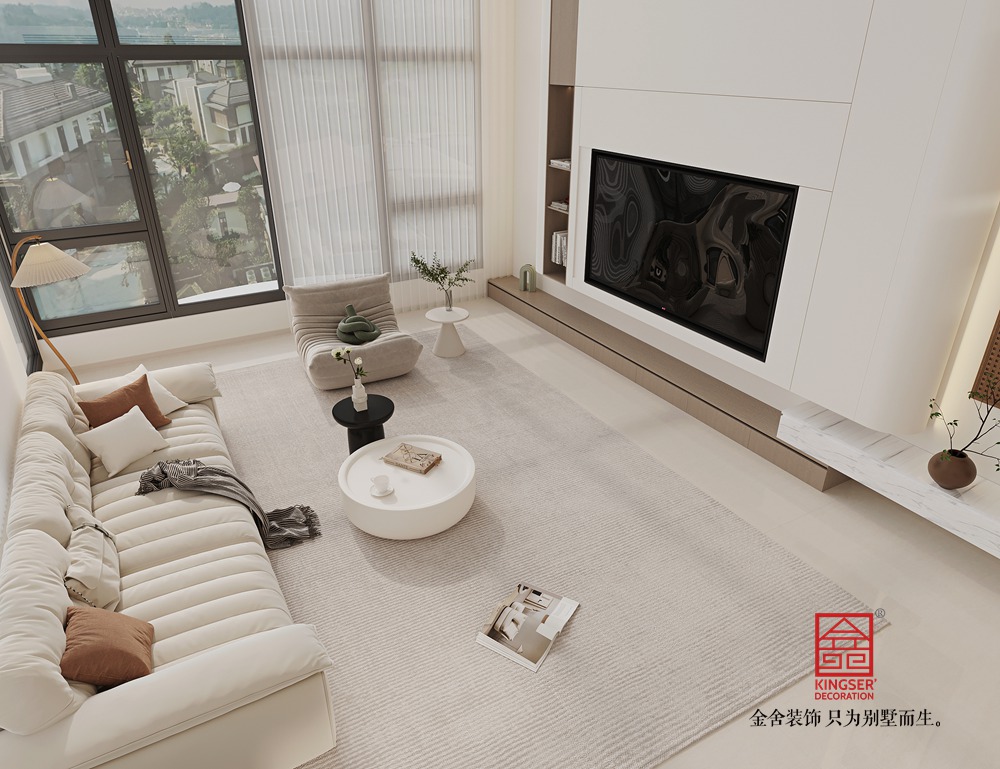 空間上,挑高設計搭配大面積玻璃窗,充分引入自然光線,讓室內外景觀相互交融,極大地拓展了視覺空間感。家具選擇注重線條的簡潔流暢與材質的柔和質感,米白色沙發、弧形單人椅等,造型簡約又不失優雅,為空間增添了溫馨感。