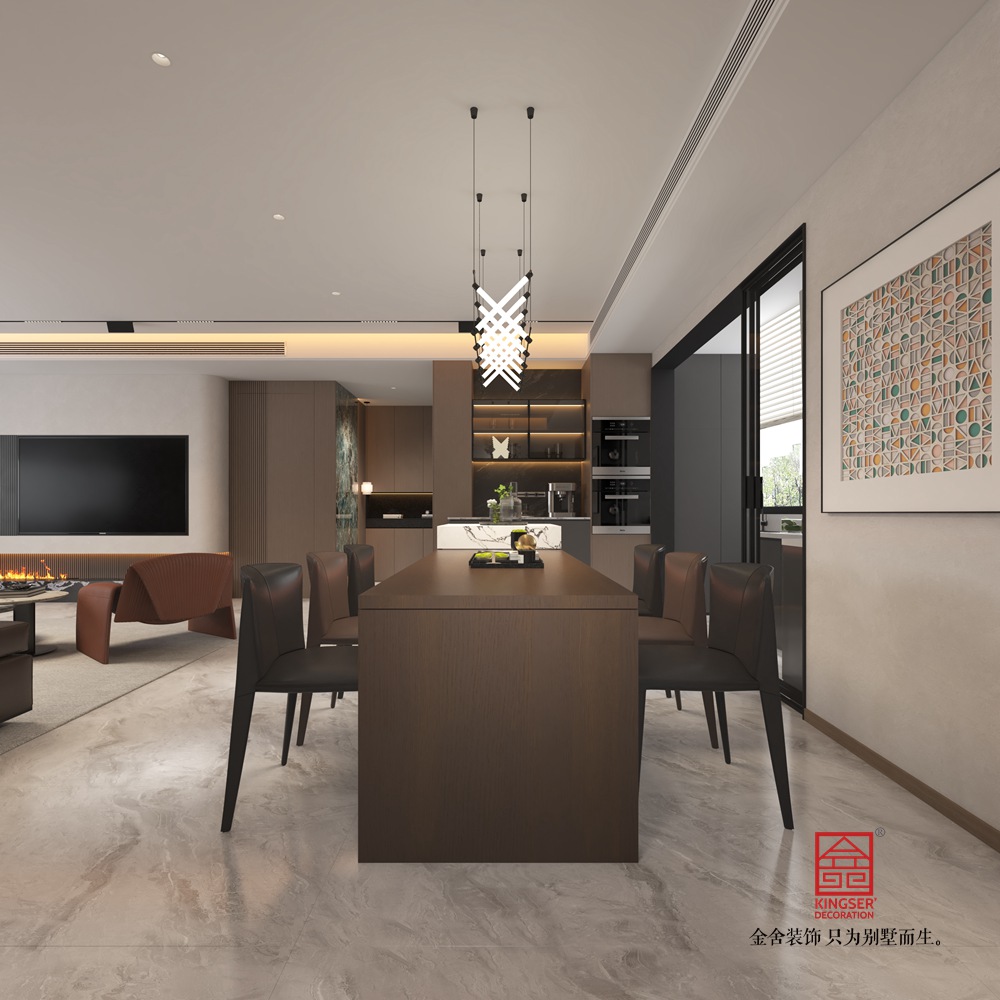 電視背景墻采用多層次設計,上方嵌入式大屏電視與下方仿真火焰壁爐形成視覺焦點,大理石紋理的壁爐基座增添奢華感,兩側的格柵與石材元素則豐富了立面層次。客廳家具選擇極簡主義單品,深棕皮質沙發的利落線條、大理石圓形茶幾的精致造型,既保證了舒適的使用體驗,又強化了空間的現代感。